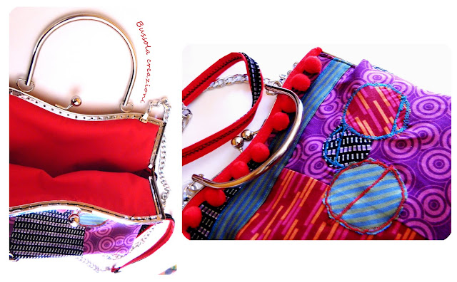 borsa con stoffe in varia fantasia e bottoni e passamaneria a pon pon con decorazioni ndifferenti sui dui lati. Chiusura clic clac e tracolla con catena piatta e inserto in stoffa e bottoncini. Fodera in tinta leggermente cerata: cosa che conferisce forma e resistenza alla borsa oltre a renderla parzialmente impermiabile.